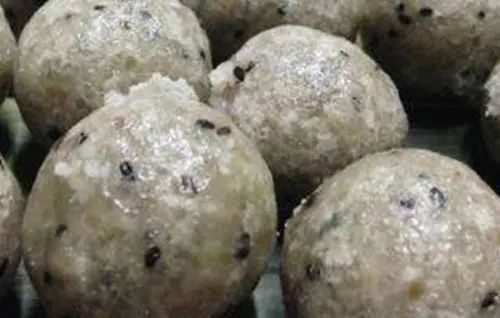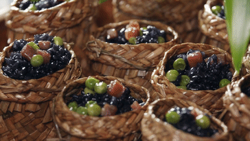 乌饭是取乌饭树的树叶,沥汁浸米,待糯米染成乌黑后炊熟,再配以腊肉、青豆、香菇等佐料,放油锅内拌炒而成。