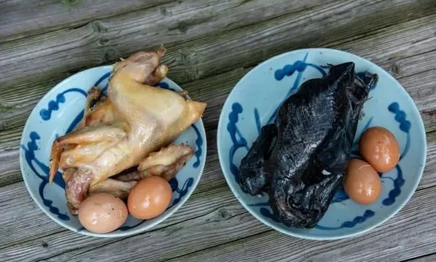 松阳人将宰杀清洗干净的土鸡晾晒,再将酒灌入肚内以盐擦之,放入香姑、葱、姜等佐料后,用棉纸包好放进沙锅,用粗盐炒热,慢火煨熟切块装盘即可。