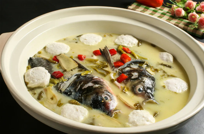 鱼头选用安仁紧水滩出产的花鲢鱼,豆腐采用纯手工制作的卤水豆腐,配之以生姜,加入自制的红椒、紫苏,佐之以酒醋等调料,经煎、煮、加料调味而成。