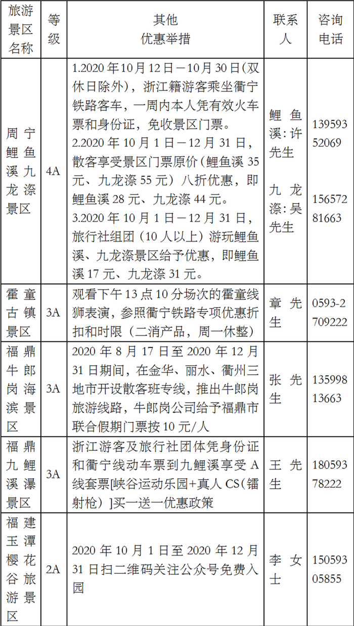 衢宁铁路正式常态通行客车后,凡浙江省游客乘坐衢宁铁路客车,一周内本人凭有效火车票和身份证,工作日免收景区大门票(不含景交车和二次消费产品),时间:10月12日-16日。