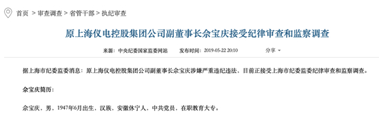 2019年5月22日,上海市纪委监委发布消息,原上海仪电控股集团公司副董事长佘宝庆涉嫌严重违纪违法,目前正接受上海市纪委监委纪律审查和监察调查。