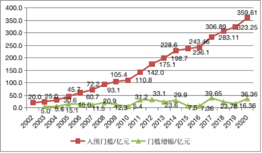 改革开放以来,随着中国经济持续快速发展,中国企业规模不断壮大,大企业数量不断增加。以中国企业500强为例,入围门槛已连续18年提高,2020年的入围门槛已经提升至359.61亿元。“十三五”以来累计提升了116亿元,增幅明显。2002年首次发布中国企业500强时,企业入围门槛年营业收入只有20亿元。