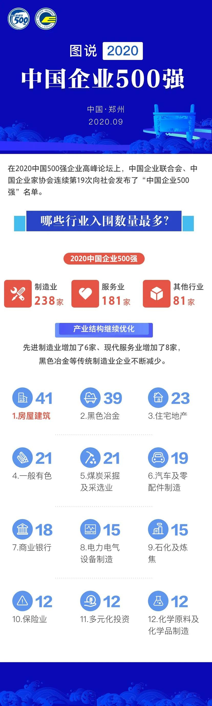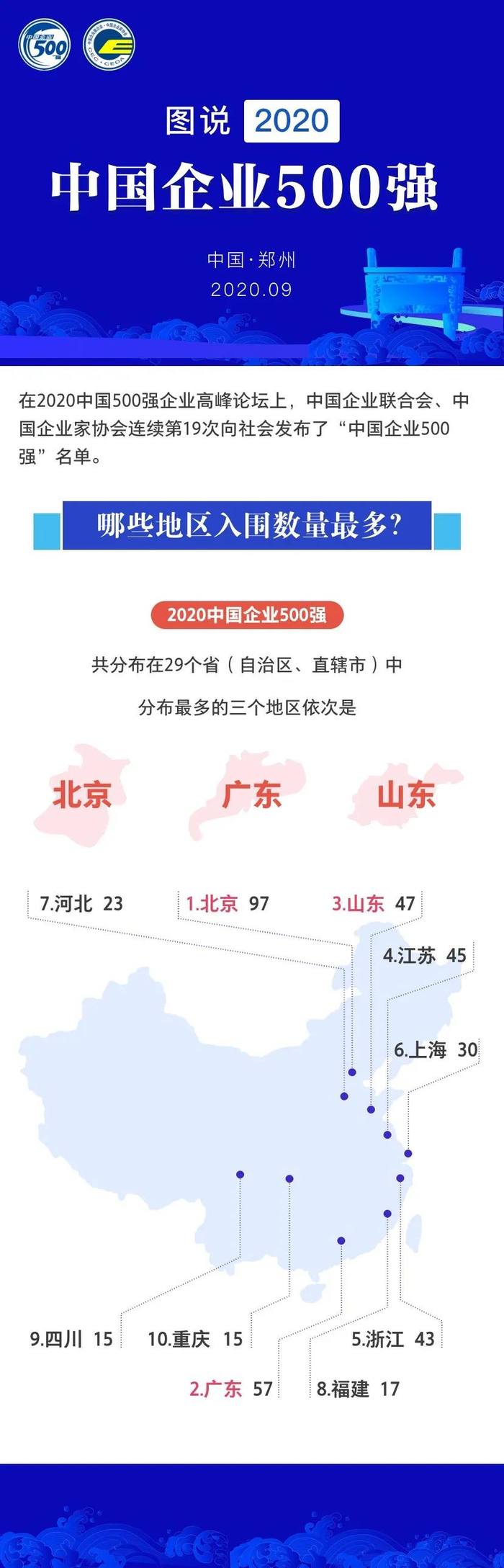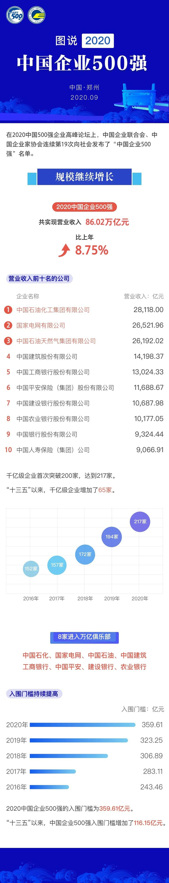 9月28日,在郑州召开的2020中国500强企业高峰论坛上,中国企业联合会、中国企业家协会公布了2020中国企业500强榜单。该榜单是参照国际上通行的做法,以2019年企业营业收入为入围标准,经专家委员会审定后发布的。据悉,这是中国企业联合会、中国企业家协会连续第19次发布“中国企业500强”排行榜。