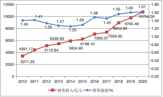 受国内外大形势变化的影响,尤其是中美经贸摩擦等因素的冲击,中国企业500强研发投入保持持续增加态势,研发强度提升到1.61%,为历史最高值水平,超过半数企业的研发强度同比都有所提升。研发投入首次突破万亿元大关,增幅为10.12%;企均研发投入为24.95亿元,比上年增长了8.85%。