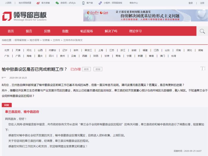 9月18日,有网友在人民网领导留言板向兰州市市长张伟文留言称,“8月份,兰州各自媒体都报道了榆中撤县设区前期工作已基本完成的消息,但是一直没有官方说明。请问该情况是否属实?若属实,是否有更新的进展?”