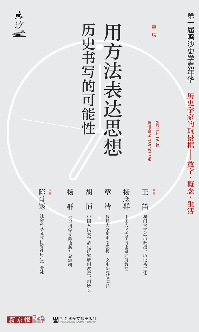 近期,社会科学文献出版社历史学分社联合新京报书评周刊,推出鸣沙史学嘉年华线上活动第一场,主题是“用方法表达思想——历史书写的可能性”。活动中,社会科学文献出版社总编辑杨群、澳门大学历史系主任王笛、中国人民大学清史研究所教授杨念群、复旦大学历史系教授章清、中国人民大学清史研究所副教授胡恒,与社会科学文献出版社历史学分社编辑陈肖寒共同探讨了“历史研究的新方法与历史书写的新可能”。
