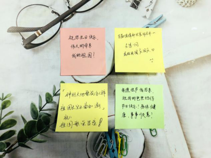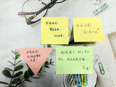 心愿树上,一个枝头贴上家的温暖,一个枝头贴上国的自豪。你也可以写下对亲友的思念、对祖国的祝福、对学校食堂的建议,或是给自己加加油、打打气。
