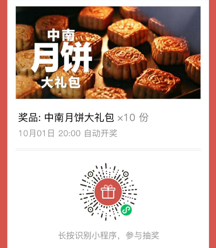 我们会从同时满足以上三个条件的读者中抽出10位幸运读者,每人送出一份五种口味各一块的中南月饼大礼包!