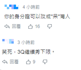 对于陈柏惟的说法,马上引起网友的吐槽,“笑死,3Q继续秀下限”“你的身份证可以改成‘呆’湾人”。