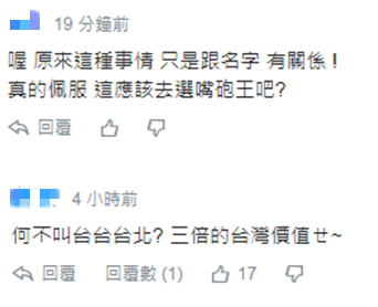 也有人说,“喔,原来这种事情,只是跟名字有关系!真的佩服,这应该云选炮王吧?”“何不叫台台台北?三倍的台湾价值。”