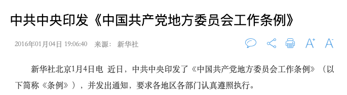 政知君注意到,2016年1月,中共中央曾印发《中国共产党地方委员会工作条例》。