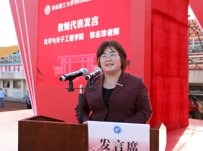 2020年上海市“为人、为师、为学”先进典型、化学学院徐志珍教授作为教师代表发言,欢迎新生们的到来。以育人为初心、打造“金课”援疆的徐老师表示,为师者要勇担立德树人的使命,对国家要有家国情怀,对学生要有仁爱之心,只有把对家国的爱、对教育的爱和对学生的爱融为一体,才能筑牢线上线下的育人阵地。她就如何度过大学生活向新生们给出建议:加强身体锻炼、保持心理健康、立志科技创新,把个人理想追求融入波澜壮阔的国家和民族事业中,成为“奔涌的后浪”。