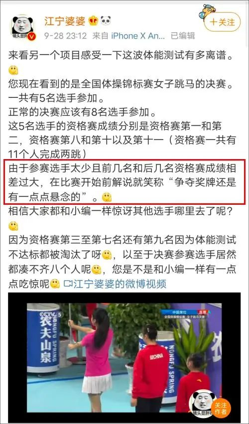 这即是说,在资格赛中成绩倒数第1的运动员,因为她前面的竞技对手被“体能测试”成绩否决,自己被增补进了决赛。网友@江宁婆婆认为,这很可能会导致决赛中的头部选手和尾部选手实力相差过大。