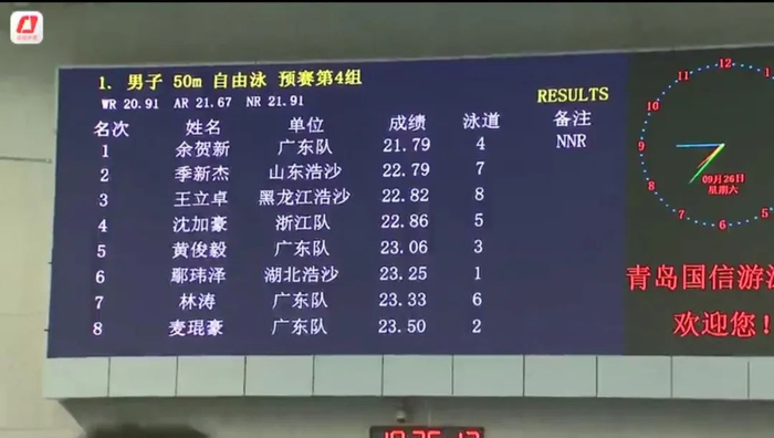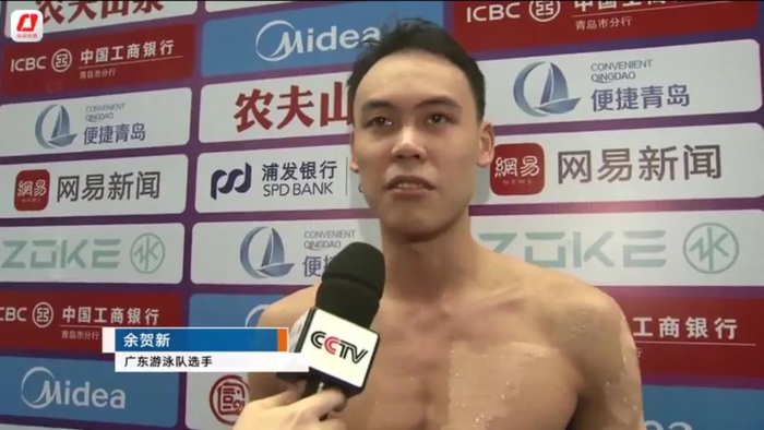 广东名将余贺新在50米自由泳预赛中,以21秒79的成绩打破宁泽涛保持的50米自由泳纪录同时达到奥运A标,但却因为体能测试仅排第九无缘决赛。广西队赵先建和河南队张家并列男子50米自由泳预赛第二,成绩均为22秒65,浙江队何峻毅以22秒73名列第四。不过他们三人中,只有张家体能测试进入前八,顺利晋级决赛。