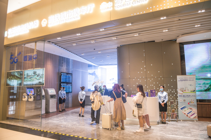 揭牌投用当天上午,几位游客一边观看大屏幕播放的城市宣传片,一边等待前来接驳的车辆。中心靠墙位置,铁路票务自助终端、机场自助值机终端依次摆放,工作人员不时帮助市民、游客办理相关业务。