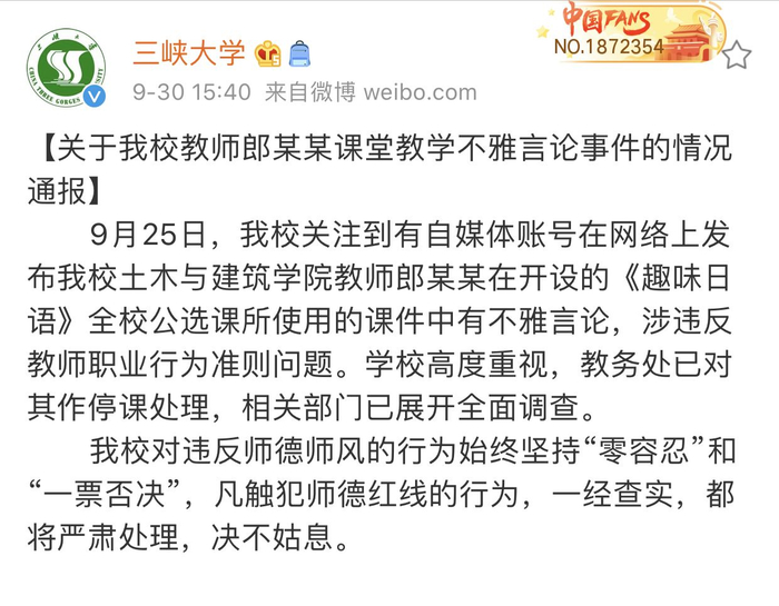 对此,三峡大学今天下午作出《关于我校教师郎某某课堂教学不雅言论事件的情况通报 》,通报表示,9月25日,该校关注到有自媒体账号在网络上发布校土木与建筑学院教师郎某某在开设的《趣味日语》全校公选课所使用的课件中有不雅言论,涉违反教师职业行为准则问题。学校高度重视,教务处已对其作停课处理,相关部门已展开全面调查。