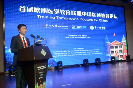 ▲匡铭教授主持欧洲医学教育联盟中国区域教育论坛并发表主题演讲