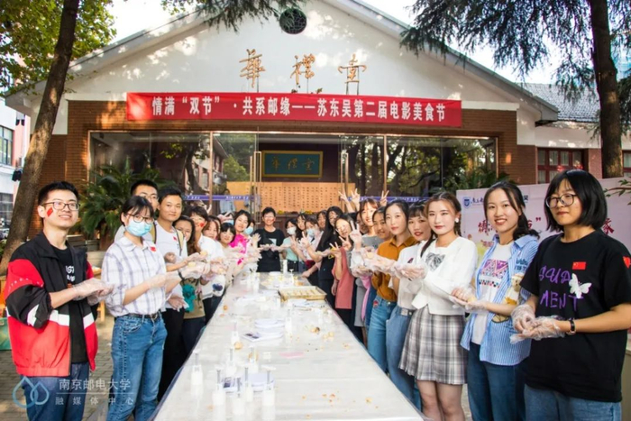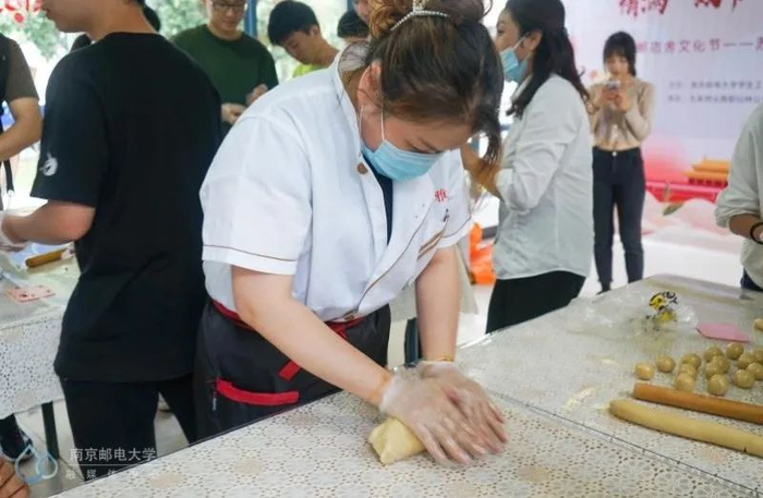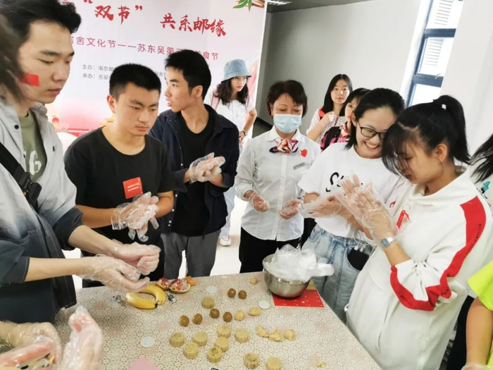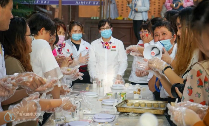 9月30日下午,三牌楼校区在华礼堂大门前举办了“情满双节,共系南邮”主题活动。东吴物业的宿管阿姨们不仅准备了制作月饼的原材料和工具,还请来了专业的西点老师指导柚子们现场制作月饼。