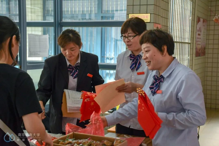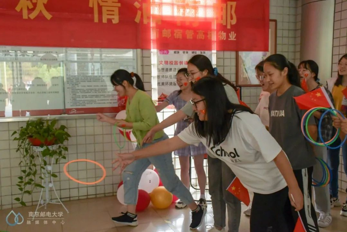 与此同时,仙林校区南区的宿管阿姨集中在梅苑一楼大厅举办了“喜迎国庆,月满中秋,情洒南邮”主题活动。活动现场,宿管阿姨们给到场的每一位同学分发月饼和小国旗。现场还设置了”表白墙”和趣味套圈游戏,还有柚子们制作手工灯笼。在场的柚子们欢声笑语,好不热闹!