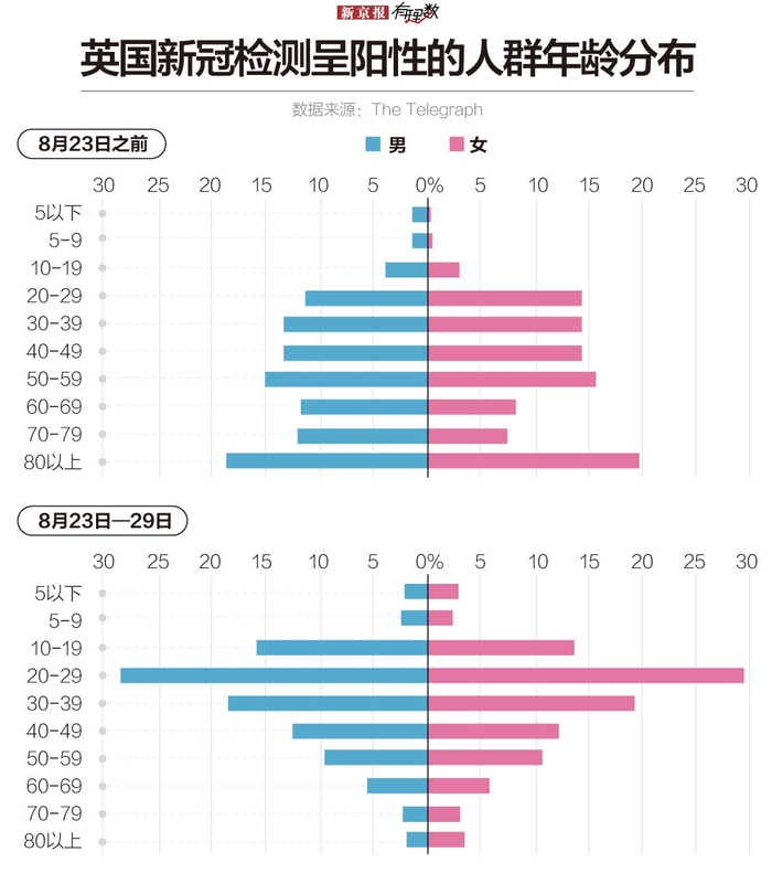 以英国为例,在8月23日之前的历史数据显示,新冠检测呈阳性的以80岁以上的老年人居多,各年龄段的确诊比例都相对均衡。而8月23日之后,20—29岁的年轻人成了主流,其次是30—39岁的青壮年,和10—19岁的青少年。