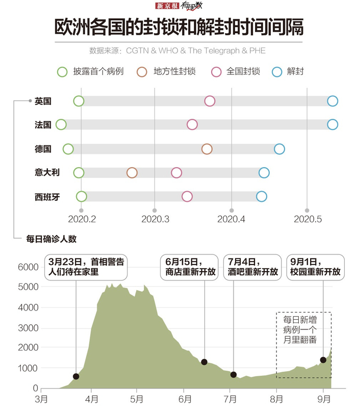 欧洲的第一波疫情高峰始于三四月份,随后的夏季里确诊数据一度回落,可最近的八九月份,
