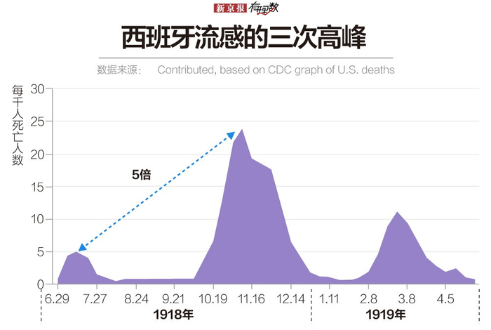 “第一波”始于1918年3月,美国堪萨斯州一个军营出现已知最早的病例,随后传到欧洲,5月开始在西班牙暴发,患病的大多是老人和病人,到夏季一定程度上平息。