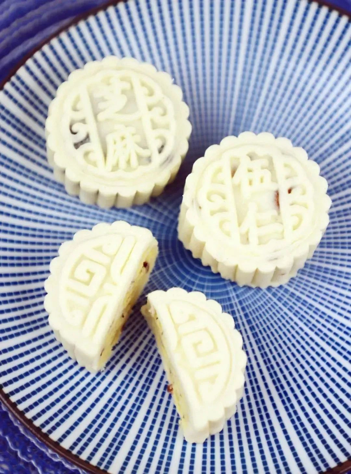 蒸出来的月饼通体雪白。一口咬开,现炒的黑芝麻馅料口感清甜;流心的馅儿一口爆浆……