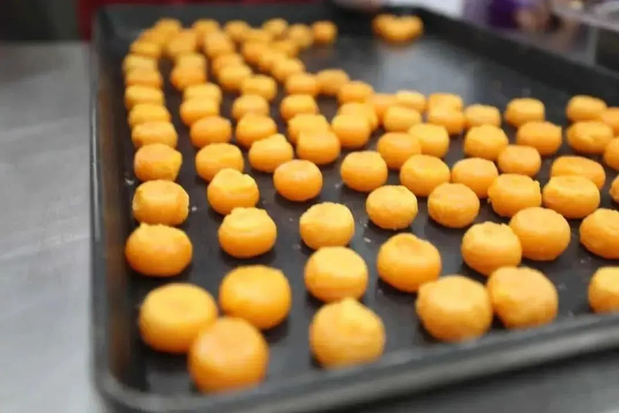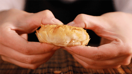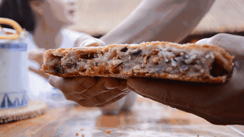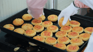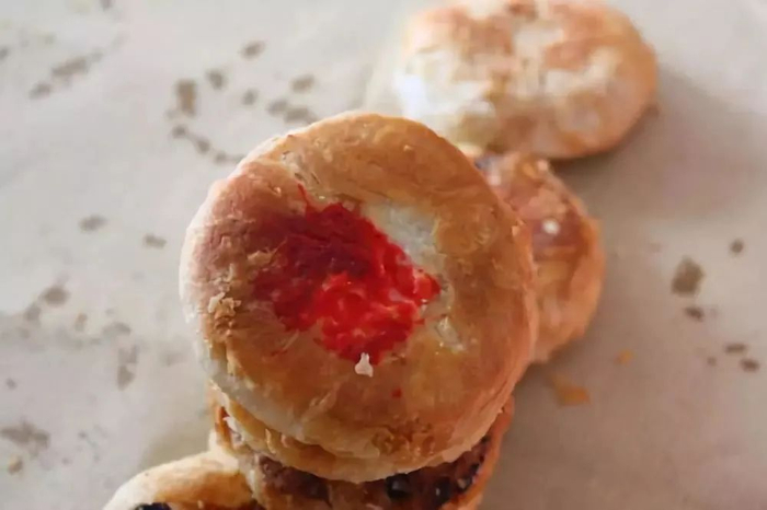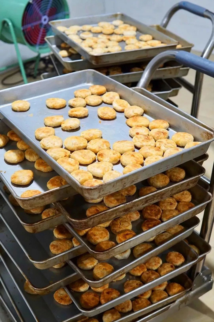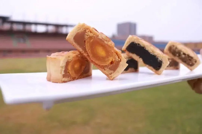 椒盐味、百果味、豆沙味、玫瑰味……刚出炉的月饼还有些温热,一口下去,皮儿酥脆,满满馅料带来超大的满足感。