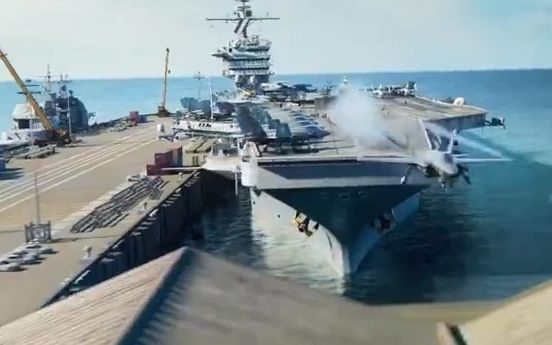 甚至,电影中有一场飞行器袭击航母编队的段落。这个情节灵感来自2017年5月,美国航母在迪拜停靠休整过4天。唐季礼研究过,袭击航母的最好时机就是在它休整的时候。迪拜那方面也给了影片全力支持,让剧组拍摄了4天关于航母的戏份。