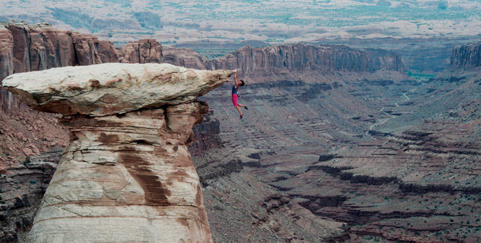 1992年,法国攀岩者凯瑟琳·德蒂韦勒用手抓住美国犹他州摩西塔的边缘,身体悬在半空中。