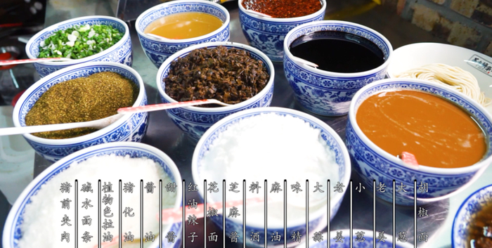 4.取面碗一个,将红油辣子、酱油、姜蒜汁水、花椒面、猪化油、芝麻酱、味精、葱花放入;