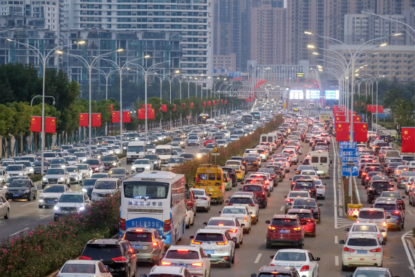 9月30日,中秋和国庆双节将至,武汉迎来节前最后一个工作日交通高峰。图为珞狮路上在高峰期通行的车辆。(图片来源:人民视觉)
