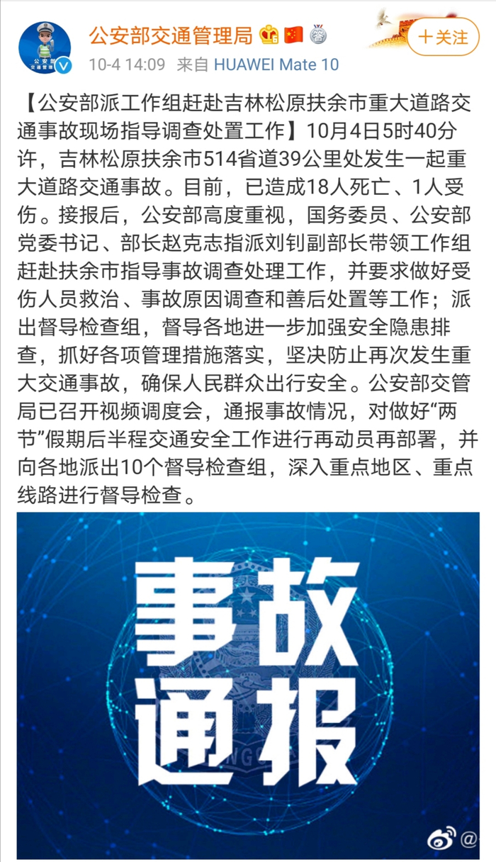 10月4日14时许,公安部交通管理局官方微博发布消息,这起交通事故已造成18人死亡、1人受伤。