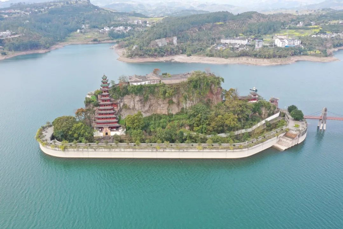 忠县石宝岛在三峡工程蓄水到175米后成为江中孤岛。岛上有著名的石宝寨,国家级重点文物保护单位,有江上明珠、江中小蓬莱之称。
