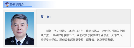 刘钊,男,汉族,1963年12月生,陕西扶风人,1984年7月加入中国共产党,1986年7月参加工作,西北政法学院法律专业毕业,大学学历,法学学士学位。现任公安部党委委员、副部长,副总警监警衔。