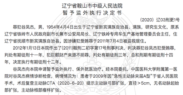 2019年7月18日作出的《谷凤杰刑罚变更刑事决定书》写道:经本院委托,中国医科大学附属第一医院对谷凤杰病情诊断检查,于2019年5月9日作出病情诊断意见为:谷凤杰右肺上叶癌、右肺上叶后段切除,淋巴结廓清术后,A型主动脉夹层术后,主动脉弓部瘤形成、夹层不除外,符合《保外就医严重疾病范围》第三(5)条。