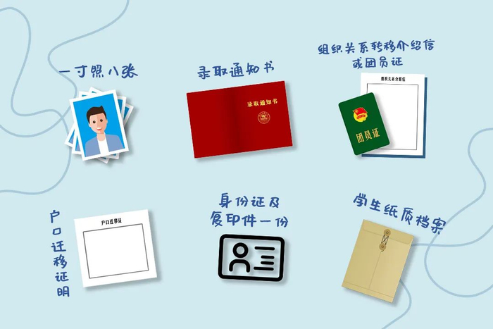 新生须携带我校录取通知书、二代居民身份证原件及复印件1份(需要正反面复印,报到时交到所在学院),本人近期免冠正面平光一寸彩照八张(同一底片)