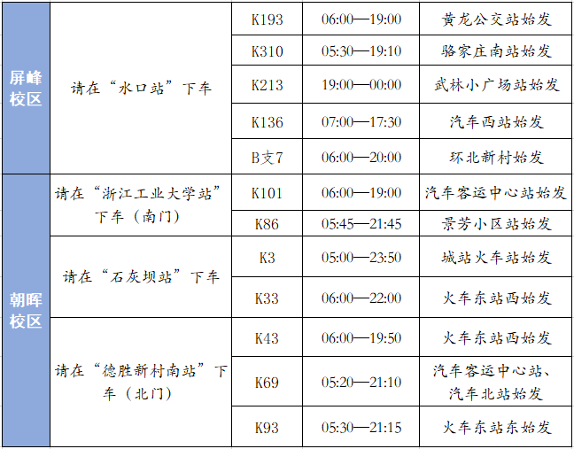 2020年10月5日8:00至20:00,学校在杭州火车站(城站)、杭州火车东站东区、杭州客运中心站(九堡)设有新生接待点,有校车接至朝晖、屏峰校区。乘坐公共交通前往我校的学生请注意全程做好个人防护