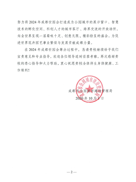 2019年起,成都市人民政府与北京林业大学、成都市公园城市建设管理局与北京林业大学园林学院先后签订了战略合作协议,持续开展了包括世园会申办在内的一系列研究和实践工作。