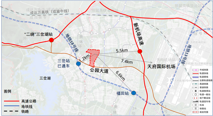 2024世园会主园区选址于成都东部新区空港新城中央绿轴——绛溪河生态走廊中部,规划总面积约161公顷,毗邻成都第二机场天府国际机场、地铁18号线三岔站、三岔CBD区,区位交通优势显著,周边配套极为完善,举办展会条件极佳。