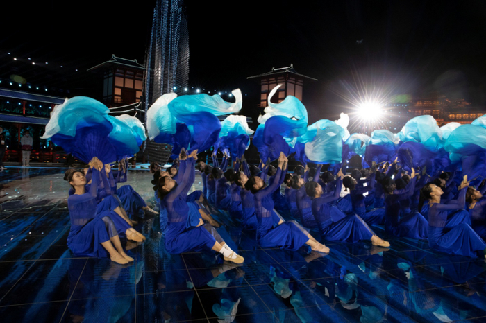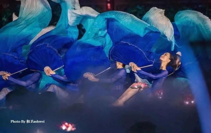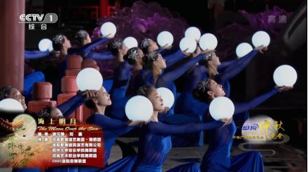 所有的努力与坚持都是为了最好的舞台。在央视中秋晚会录制现场,身着深蓝色的纱裙,音乐学院学子带来了舞蹈《月光》,她们双腿并拢屈膝正坐于舞台中央,排列成“闪电”型,舒展着的双臂从前至后依次轻柔地抬起、放下,像是被风吹动的层层波浪。灵活的指尖轻微颤抖,似是模仿月光粼粼。配合着婉转的曲调,上半身依次后仰复而坐起,双腿在空中交替划出曲线,随着曲调达到高潮,舞者们齐刷刷地甩开蓝色长扇,扇面或不断抖动,似浮光跃金,或曲线般律动,翻飞飘逸如行云流水。至伴乐尾声,扇面落下铺满地面,舞台再次归于一片宁静。