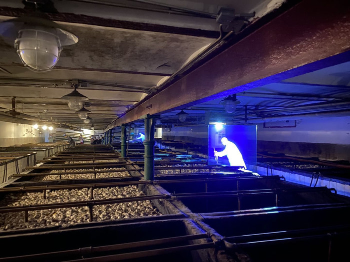 B馆是生产工艺区域,里面陈列着老式建筑物、老设备及车间环境与生产场景。同时,在生产流程中的每一个代表性部位放置有放像设备,介绍青岛啤酒的生产流程及历史沿革。为重现历史原貌,博物馆在老糖化车间的老发酵池设置了工人生产劳动雕塑模型,复制出老实验室场景和工人翻麦芽场景。