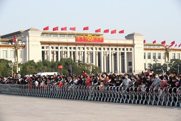 10月3日,国庆假期第三天,北京天安门广场人山人海。(图片来源:视觉中国)