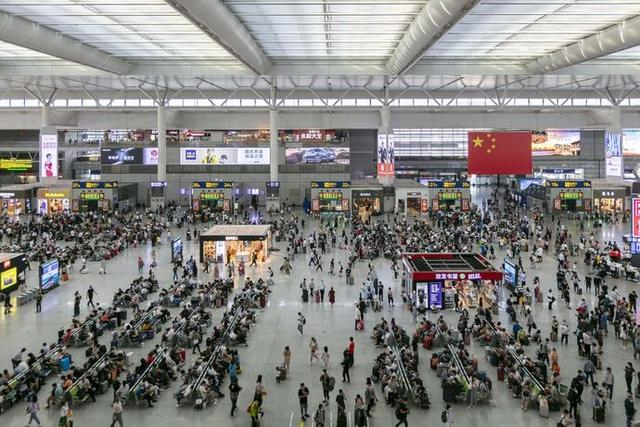 10月2日,长三角铁路“十一”黄金周客流保持高峰,这是10月2日拍摄的上海虹桥火车站候车大厅。(图片来源:新华社 王翔 摄)