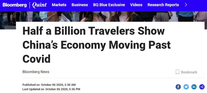 在彭博社看来,随着新冠疫情在中国已基本得到控制,黄金周假期展示了中国对经济复苏及其公共卫生措施的信心。根据中国文化和旅游部公布的数据,10月1—4日,全国共接待国内游客4.25亿人次。