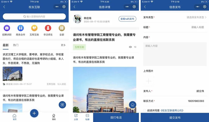校友用户通过“校友互联”服务,可以很方便的发布招聘求职、商务合作、互帮互助、寻访师生等各类资源信息,实现校友间资源信息的共享与对接,提升校友生态互联的价值。