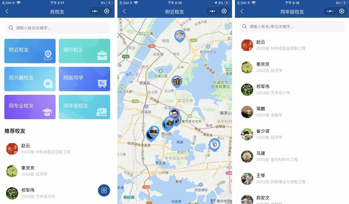 校友用户通过“找校友”服务,可以很方便的查询附近校友、同行校友、同兴趣校友、同班同学、同专业校友、同年级校友等。便捷的名片交换功能,可以很方便的建立校友联接。通过名片的开放权限设置,也不用担心个人信息泄露和用户骚扰。