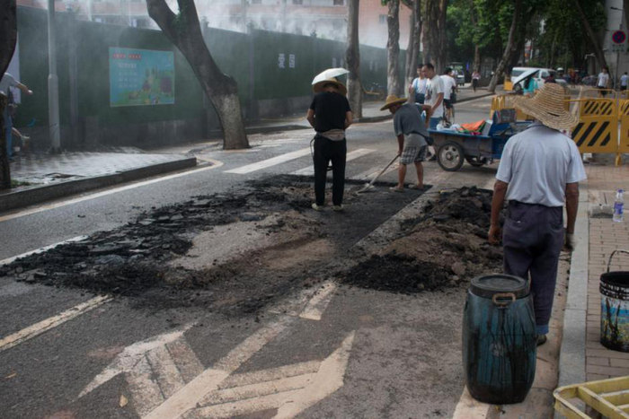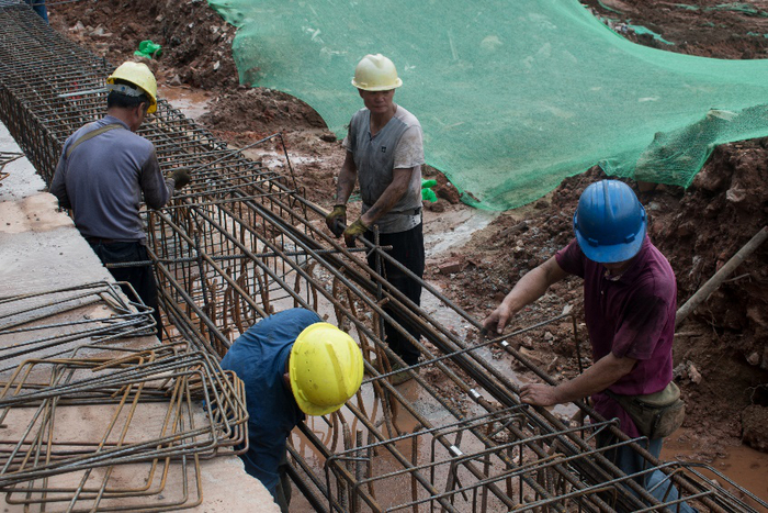 除了政策和技术上的因素,夜间施工也考虑到了工人的安全健康。工地目前在地基施工阶段,毫无遮蔽,工人们平均要在烈日下作业10个小时左右。不久前施工现场出现过工人中暑的状况,所幸及时送医,工人身体并无大碍。