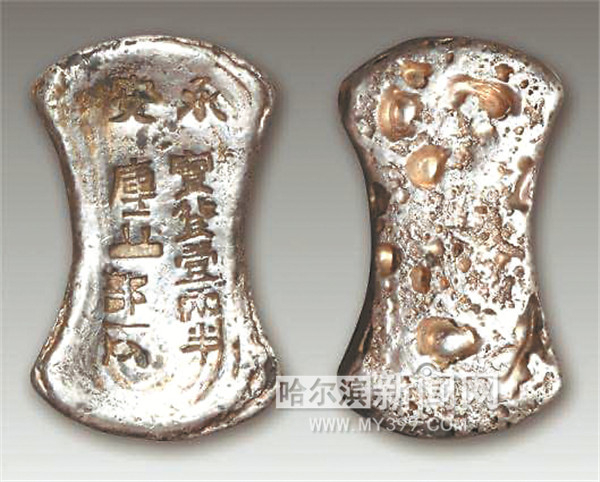 在一楼的古代钱币展厅正中,有两枚银铤格外引人注目,这两枚银铤就是文物馆里的镇馆之宝“承安宝货”。“承安宝货”是中国历史上真正意义的白银货币,发行地就在包含今天哈尔滨在内的金朝统治地区,因为流通时间短,存世非常稀少,国内至今仅发现15枚,哈尔滨文物馆馆藏3枚,此次展出了其中的两枚。