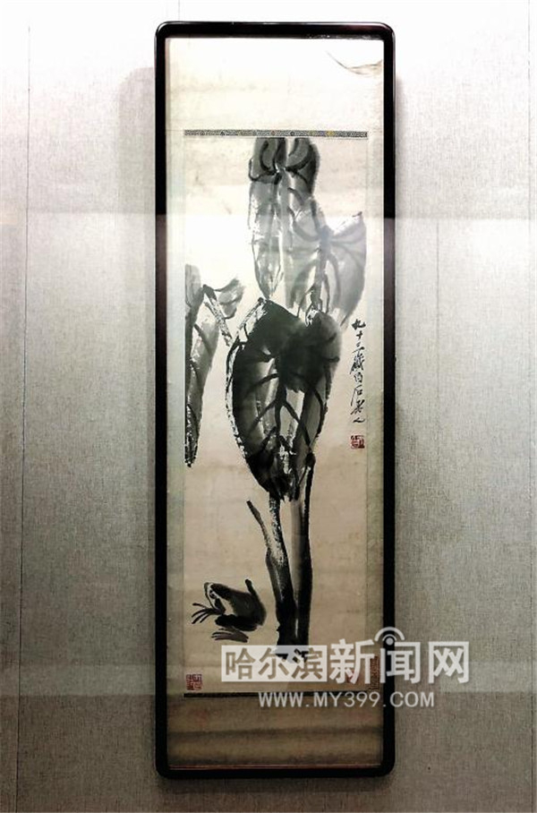 胡雷告诉记者,三楼的书画作品均是哈尔滨图书馆的馆藏,这次是首次与世人见面,其中有齐白石93岁时创作的《茨菇青蛙》图轴,还有李可染的《秋牧图》、李苦禅的《八哥图》,以及康有为的《行书七绝游杭黄龙洞》横轴等珍品,都是难得一见的佳作。